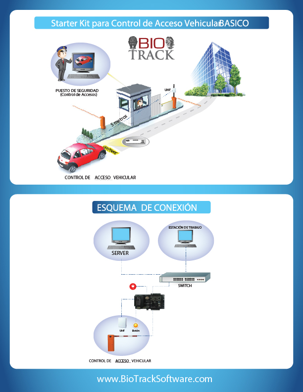 Kit Básico de control de acceso vehicular. Incluye: 1 x botón de apertura (BT-BTN), 1 x Lector UHF (BT-UHFMR100), 5 x tags de parabrisas (BT-UHFWST), 5 x Tarjetas de PVC UHF (BT-UHFIDC), 1 x Panel de Control de Acceso (BT-ACP4), 1 x Convertidor de RS232 a USB (BT-USBRS232), Software de Control de Acceso.